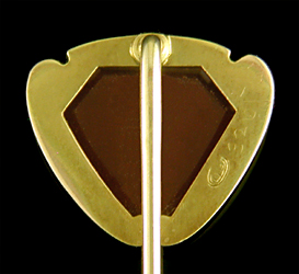 Hans Brassler was a gifted jewelry maker who in the early 1900s created a collection of stickpins, brooches and other jewels that are miniature works of art. He drew inspiration from nature, fantasy and past historical periods to create unique, imaginative jewels with an elegant sense of style. This stickpin is finely crafted with a sturdy gold frame to protect the carnelian (see photo below). The maker's mark of The Brassler Company, a double oval surrounding "14B" is stamped on the lower right of the reverse. Cost: Although this elegant stickpin has sold, you will find many more fine stickpins in the Antique Stickpin Gallery. |