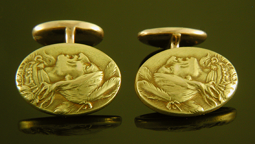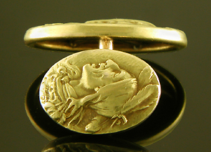 ![]() The backs of the cufflinks repeat, on a smaller scale, the richly detailed image of the Native American seen on the front. During the Victorian era the backs of cufflinks were often left unadorned or merely engraved with the wearer's initials. This left the backs looking somewhat plain and unfinished. For a brief period around 1900 Krementz & Co. introduced a small collection of cufflinks with decorated backs. The backs repeated the design of the fronts or were decorated with a similar theme. Known as "Krementz doubles" these cufflinks testify to the firm's innovative spirit and desire to create cufflinks that were beautiful and engaging from every direction.