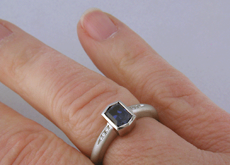 | This ring is handcrafted in platinum. The Morph-cut Sapphire weighs 1.27 carats. The six diamonds weigh a total of 0.037 carats. The ring is finger size 6 1/2 and can be resized to fit most fingers. | ||