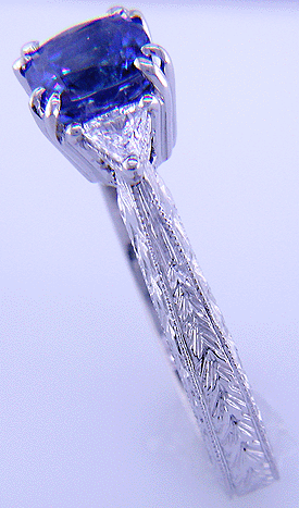 This engraved Tanzanite ring has sold. Please visit our Engraved Rings Gallery where we feature other beautiful engraved rings. Or, we can custom create a ring in this style for you using the gemstones and precious metals of your choice. Please give us a call (603 624-8672) or send us an email, to discuss gemstones, design options and costs. |