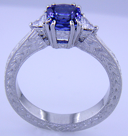 | Cool, crisp and elegant best describe this striking tanzanite ring. The velvety violet blue tanzanite is set with two sparkling, trilliant-cut diamonds in a beautifully hand-engraved platinum ring. The brilliance of the diamonds offers a striking contrast to the blue shades and subtle red flashes of the center stone. This elegant ring was hand crafted and hand engraved. | ||