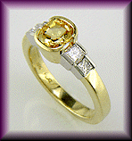 Golden Steps A custom created ring featuring a cushion-cut sapphire that is a beautiful golden yellow .... like a glowing harvest moon. The sapphire is set in an 18kt gold half bezel. Along the shoulders of the ring four princess-cut diamonds are set in platinum. |